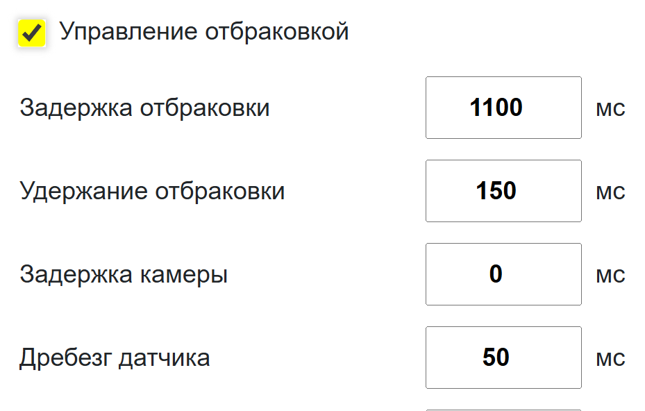 (ВАЖНО) Задержка на отбраковку должна быть всегда больше, чем задержка на камеру. После триггера камера должна успеть распознать код, отослать его в Л2, а Л2 в свою очередь должен успеть обработать этот код, найти в БД, проверить его и отослать хороший или плохой статус в ПЛК. После этого ПЛК штатно активирует отбраковку. Если же задержка на отбраковку истечет раньше чем ПЛК получит статус от Л2 - ПЛК отбракует принудительно и Л2 выдаст ошибку "отбракован по умолчанию" или "ед. продукции была отбракована без информации с камеры". Именно поэтому имеет место быть следующее требование [задержка отбраковки > задержка камеры + 200мс] (200 мс - наиболее частая минимальная разница).