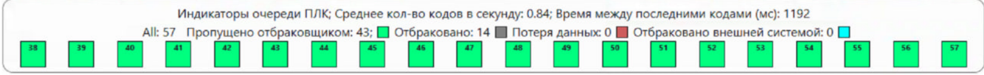 Отображение истории по принятию решения об отбраковке/пропуске продукции. История будет отображаться на экране сериализации в режиме "старт". Каждая запись в истории имеет цвет, сигнализирующий о её типе, а также идентификатор, написанный внутри