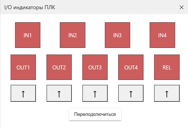 Открыть панель отображения входящих и исходящий сигналов ПЛК. На этой панели пользователь может увидеть сигналы ПЛК в реальном времени (активированные входы и выходы будут загораться зеленым цветом), а так же подать выходящий сигнал вручную по кнопке стрелки. |