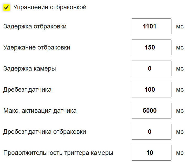 Блок управления отбраковкой. Задержка отбраковки - время между срабатыванием датчика и принятием ПЛК решения об отбраковке/пропуске кода. Удержание отбраковки - время удержания сигнала отбраковки. Задержка камеры - время между срабатыванием датчика и триггером камеры. Дребезг датчика - время после сигнала срабатывания датчика, на протяжении которого не будет приниматься новый сигнал. Должен быть чуть больше, чем длина единицы продукции. Макс. активация датчика - максимальная продолжительность сигнала с датчика, при достижении которой будет выдана ошибка и остановлен текущий режим работы. Используется для выявления запыления или смещения датчика. Дребезг датчика отбраковки. Датчик отбраковки - специальный датчик, который стоит после камеры, очень близко к отбраковщику. Параметр нужен для режима, когда отбраковка происходит не по задержке, а по срабатыванию второго датчика (отбраковки). Продолжительность триггера камеры - продолжительность сигнала на триггер камеры. По умолчанию, вне зависимости от длительности сигнала (превышающей минимальную указанную в настройке камеры) камера делает один снимок. Включение серии снимков по длительности сигнала камеры описано здесь. |